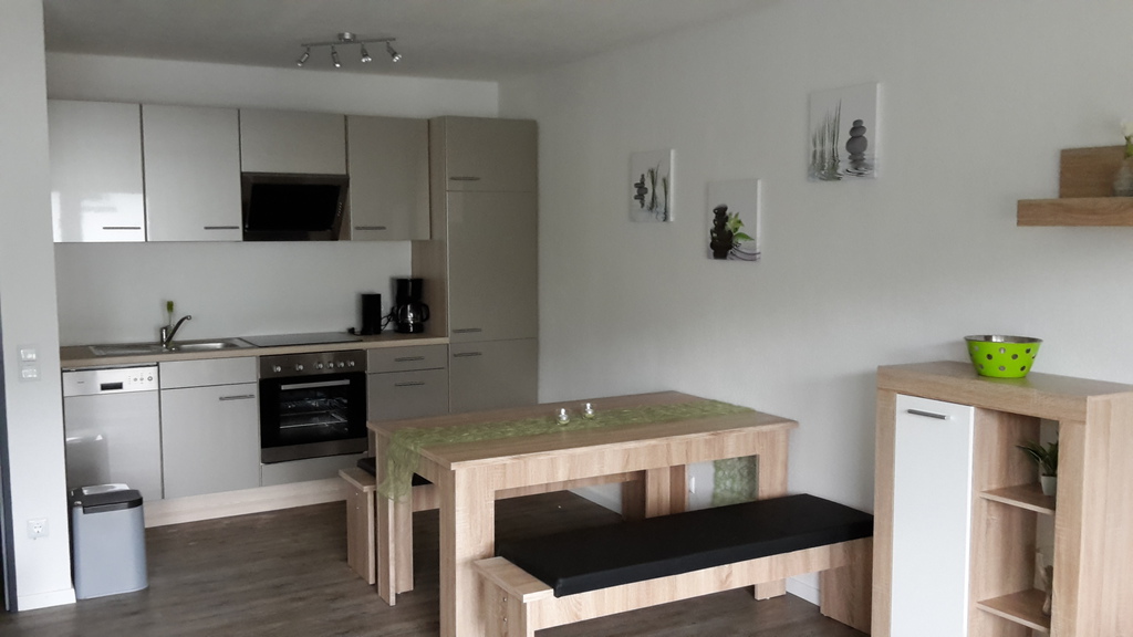 Der Wohnraum besteht aus einer abgeteilten Küche mit Essplatz und ist komplett eingerichtet mit Spülmaschine, Backofen, Wasserkocher und Toaster. Zusätzlich zu der Filter-Kaffeemaschine steht Ihnen eine Dolce Gusto-Kapselmaschine zur Verfügung.
