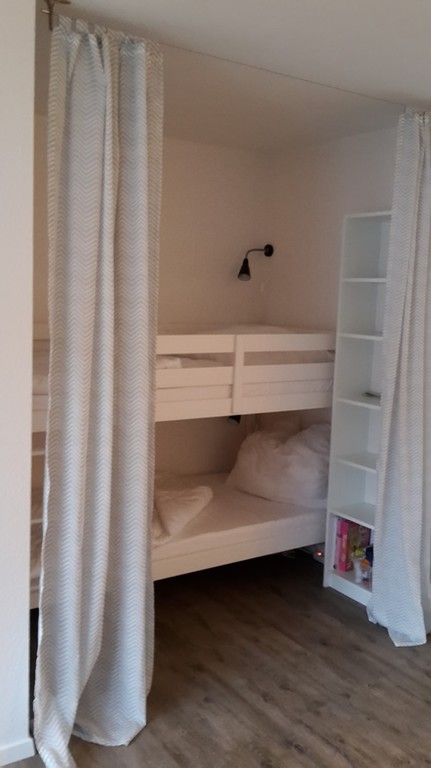 Im Wohnraum gibt es einen abgeteilten Bereich mit einem Etagenbett.